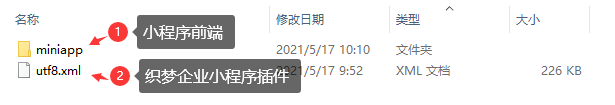 解壓后得到織夢企業官方網小程序插件和一個miniapp小程序前端包文件夾