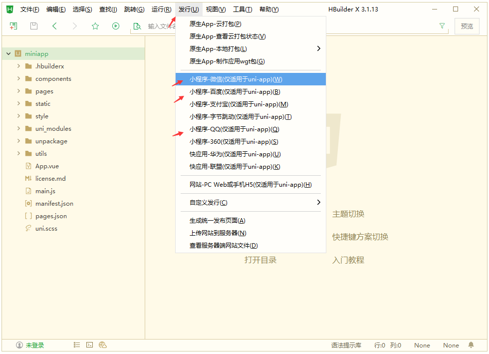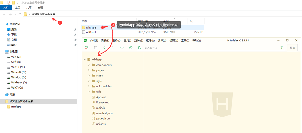 7、在 HBuilderX 軟件里導入 miniapp 小程序前端包文件夾