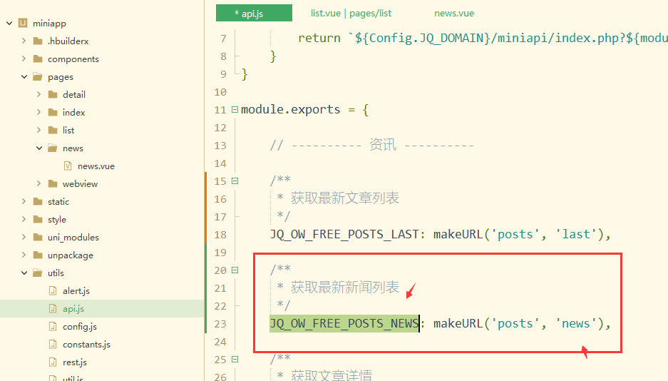 在api.js里添加新接口地址和變量與news.vue里的調用接口變量相同