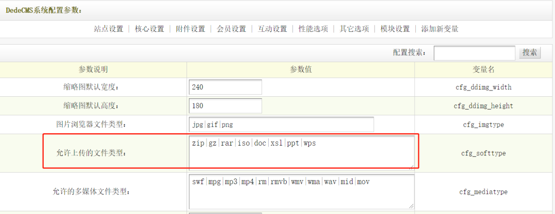 需要說明的是,DedeCMS 默認是不允許上傳 pdf 文件的,我們需要到附件設置里設置一下。