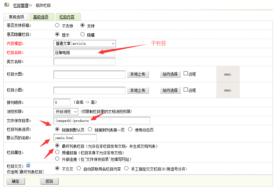所有子欄目,文件保存目錄都跟頂級欄目一樣,但是默認頁的名稱不一樣,例如