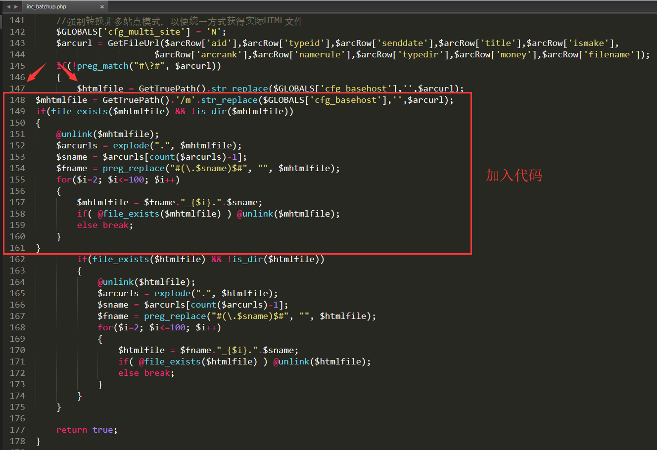 $mhtmlfile = GetTruePath().'/m'.str_replace($GLOBALS['cfg_basehost'],'',$arcurl);if(file_exists($mhtmlfile) && !is_dir($mhtmlfile)){@unlink($mhtmlfile);$arcurls = explode(".", $mhtmlfile);$sname = $arcurls[count($arcurls)-1];$fname = preg_replace("#(\.$sname)$#", "", $mhtmlfile);for($i=2; $i<=100; $i++){$mhtmlfile = $fname."_{$i}.".$sname;if( @file_exists($mhtmlfile) ) @unlink($mhtmlfile);else break;}}