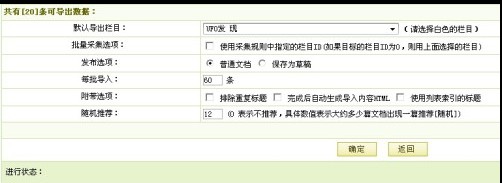 首先選擇要導(dǎo)入到的欄目,按“請(qǐng)選擇”那里即可在彈出的窗口中選擇你需要導(dǎo)入的欄目發(fā)布選項(xiàng)這里一般默認(rèn)即可,除非你不想馬上發(fā)布。每批導(dǎo)入默認(rèn)是30條,這里修改與否都無(wú)所謂,附帶選項(xiàng)一般選“排除重復(fù)標(biāo)題”,至于自動(dòng)生成HTML那個(gè)選項(xiàng)建議先別生成,因?yàn)槲覀冞€要去批量提取摘要和關(guān)鍵字