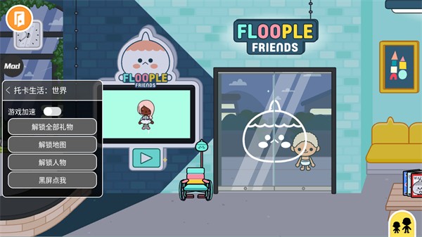 6.點(diǎn)擊左側(cè)的MOD選項(xiàng)即可打開(kāi)功能菜單,里面包含游戲加速、解鎖全部禮物、解鎖地圖、解鎖人物以及黑屏解決功能,能讓你更輕松地體驗(yàn)游戲。