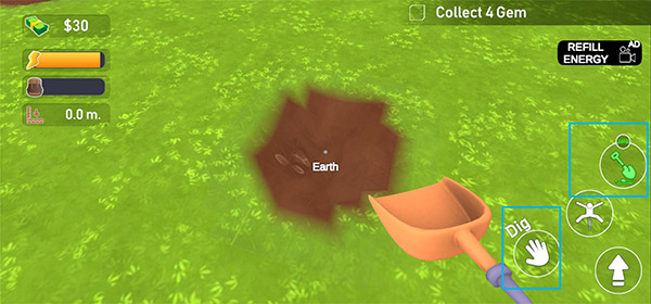 通過點擊屏幕或滑動屏幕來操控角色挖掘土層、沙層和巖石層,持續向地下深處掘進。