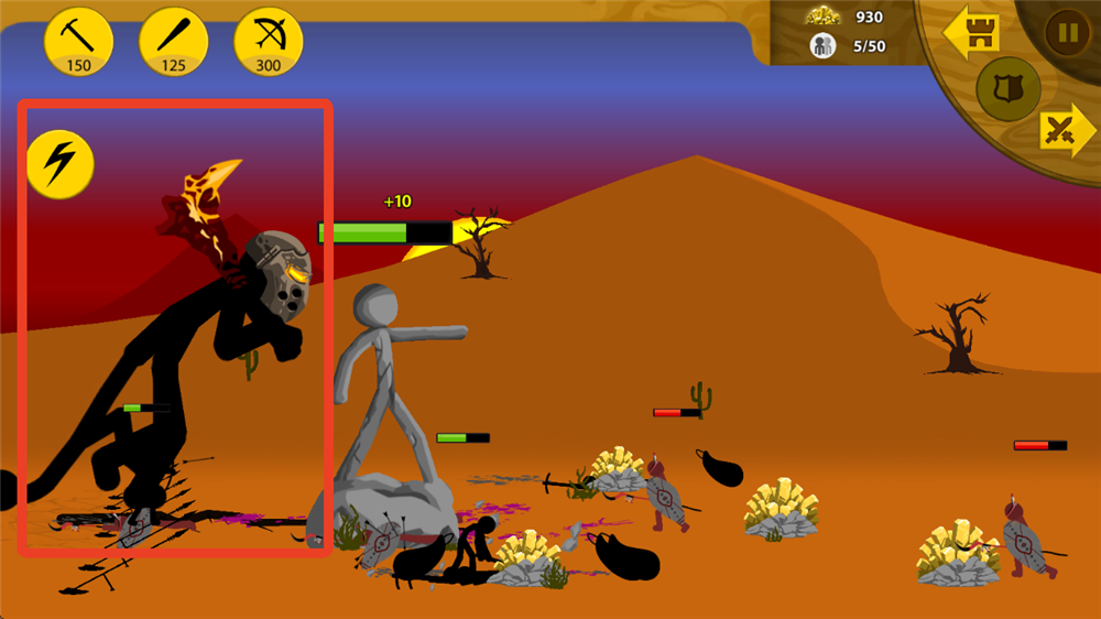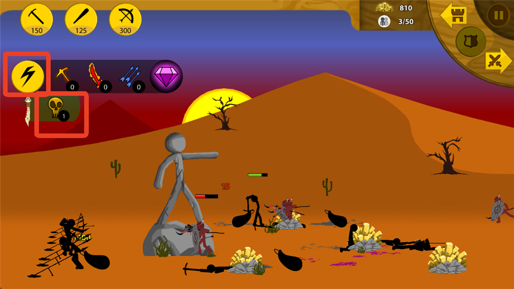 5、購買成功后可以點擊戰(zhàn)場上左邊閃電形狀的按鈕,然后再選擇底下黃色骷髏。
