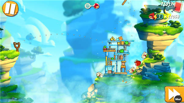 第5關:到了第5關可就沒有引導了,需要從紅、藍、黃鳥中選一個,小編推薦利用小紅的技能吹動第一個建筑向前滾動(用藍、黃鳥需要打下方的輪子),然后順利砸壞右方的建筑,也終于見到了小鳥2代的亮點之一“大型BOSS豬!”,看到下方長長的血條你怕不怕?不用擔心,交給身懷絕技的小鳥和聰明的你絕對沒問題哦。首先,利用小紅將第一個建筑向前吹,砸爆大胖豬。然后用黃鳥瞄準下圖中的三角形冰塊,只要冰塊一碎,大量的滾石就會傾盆而下!就算BOSS豬血再多肉再厚也會把它砸個稀巴爛!