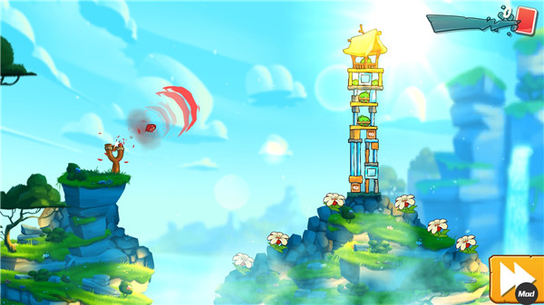 第1關:這一關并不難,實際上是作為教程設計的。你需要把小紅射向炸藥箱以引發連鎖爆炸,并利用小紅的怒吼技能將石頭和冰塊吹向右側的炸藥箱和搗蛋豬。
