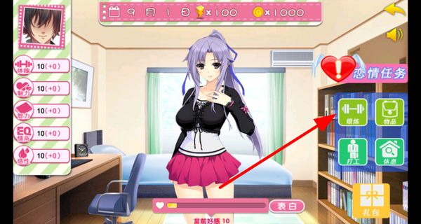 3、可以點擊鍛煉等選項提升自身屬性,讓自己女友更具魅力,同時還有戀情任務可以參與。