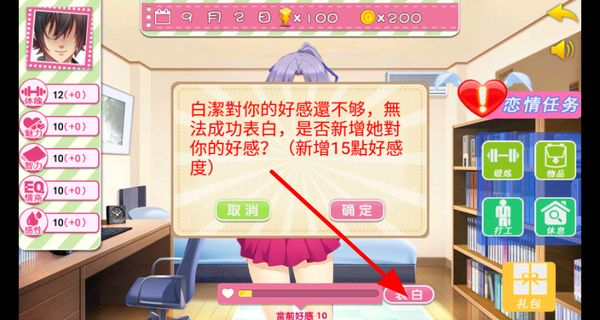 4、與心儀對象互動,當好感度足夠時可嘗試表白,若好感度不足,可選擇新增好感度后再表白。